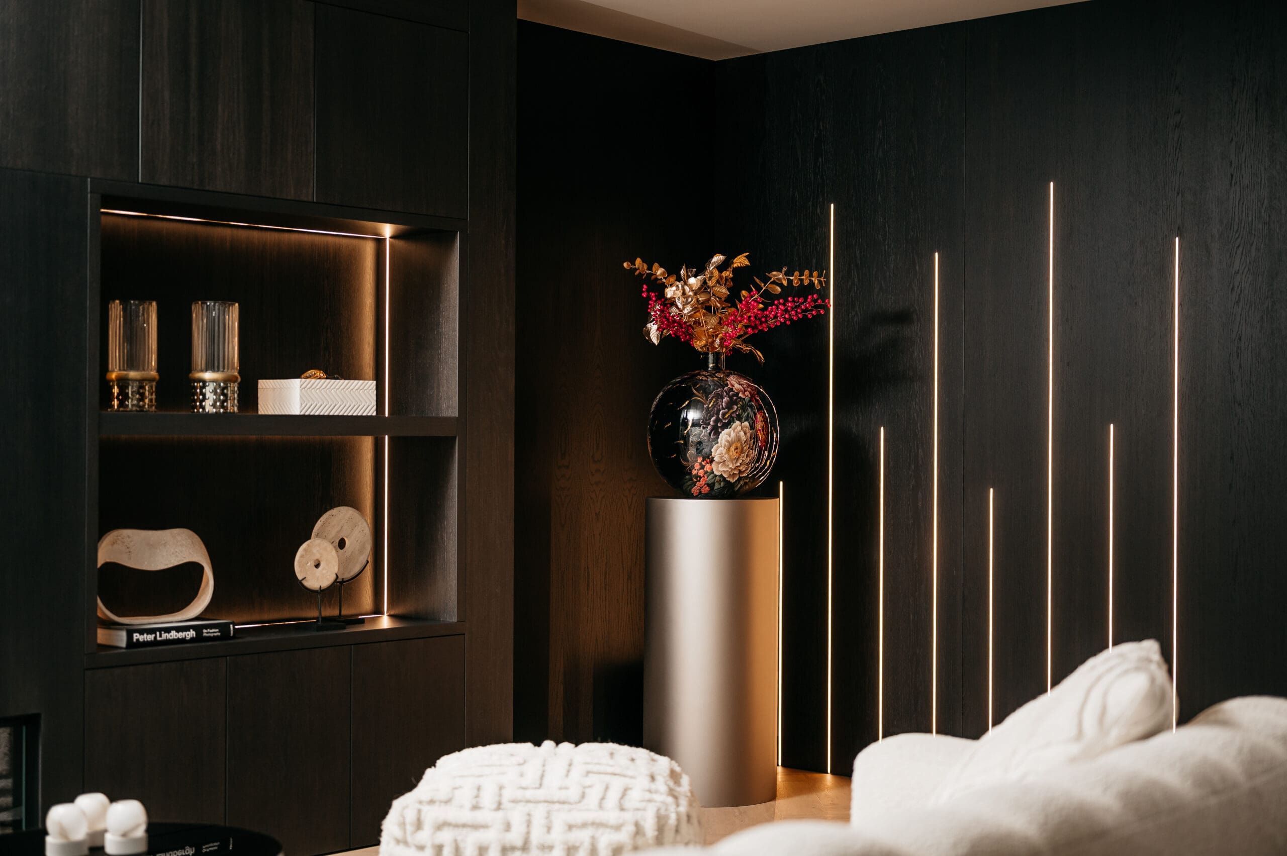 Creëer de perfecte ambiance met sfeervolle led-strips onder jouw maatwerk cinewall of subtiele spotjes in open vakken. Een cinewall op maat, precies zoals jij het voor ogen hebt.
