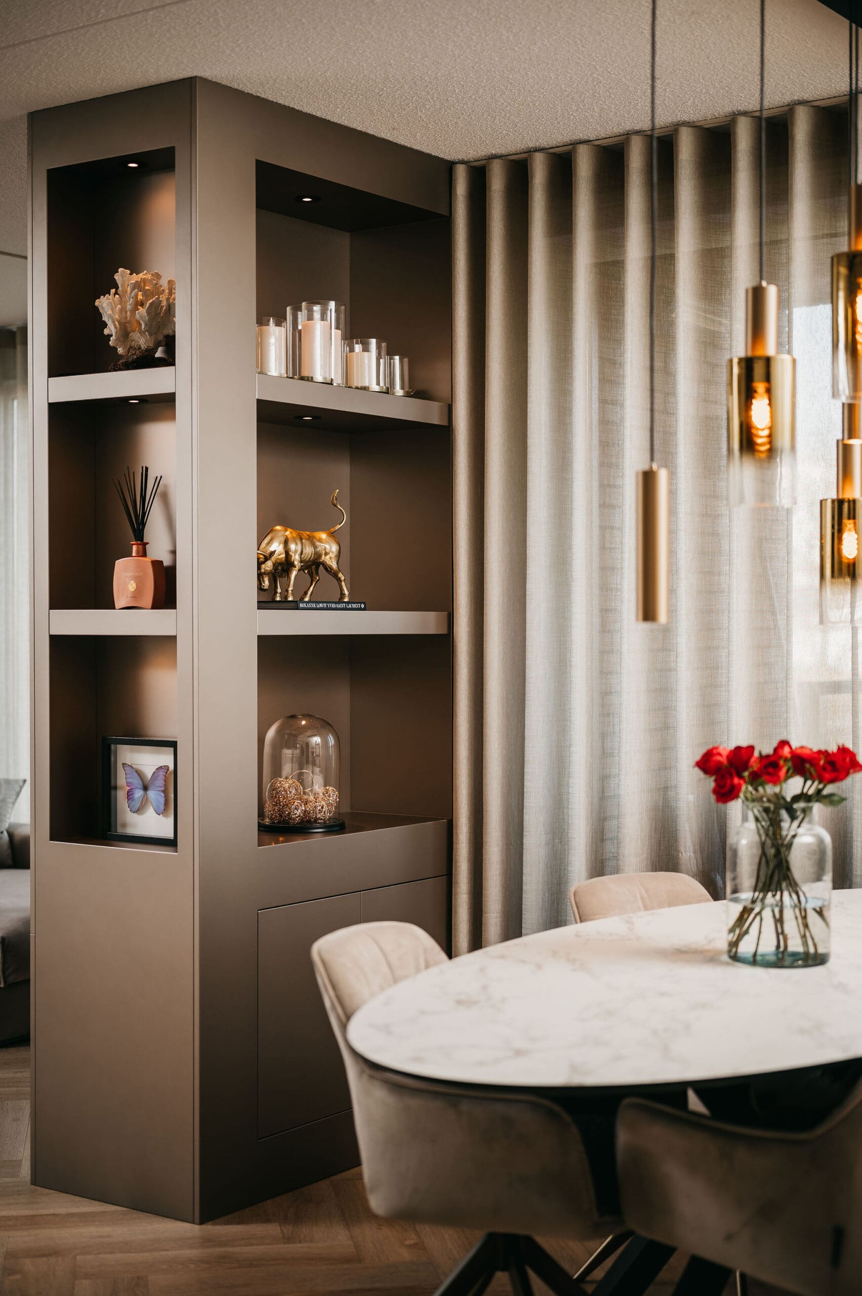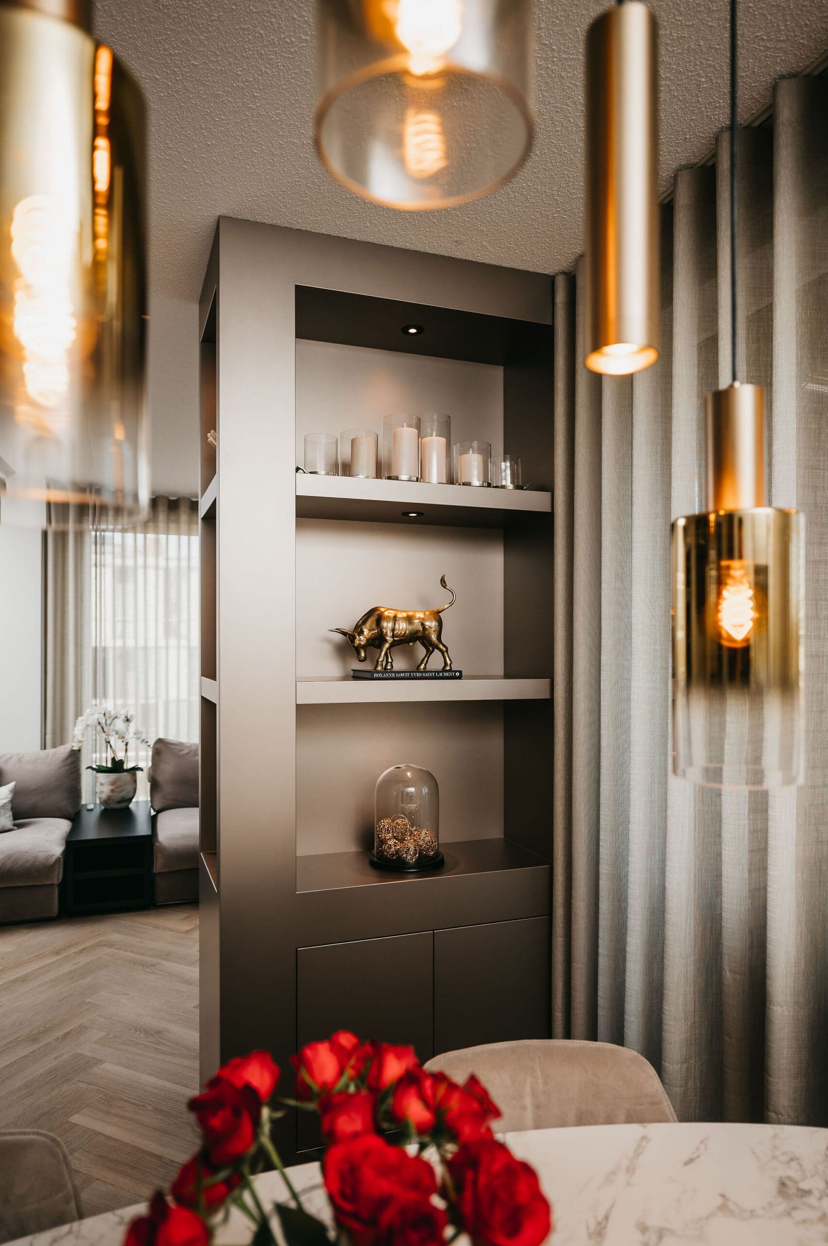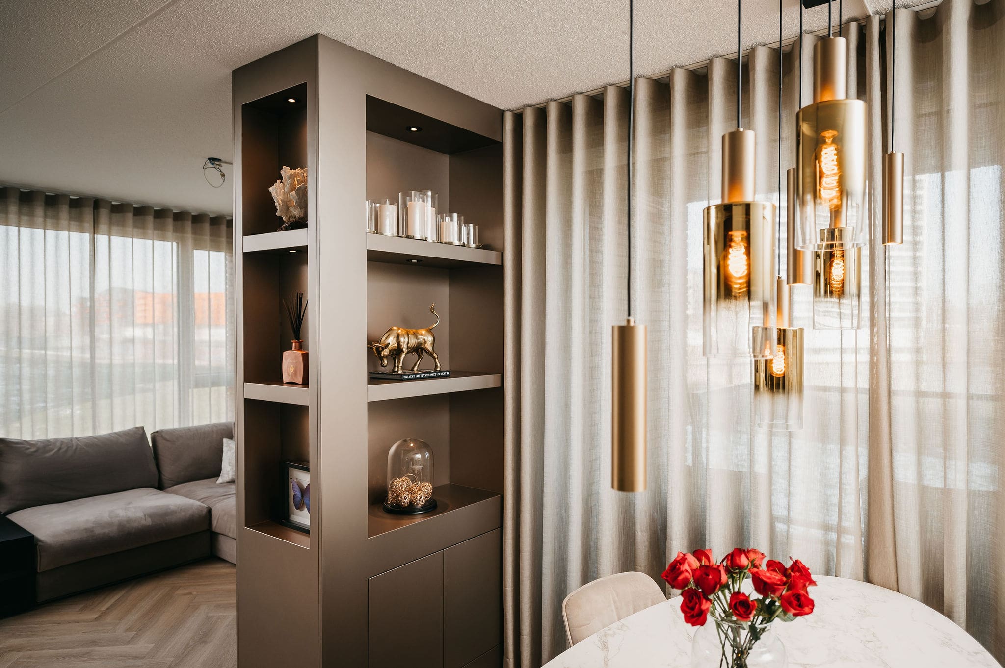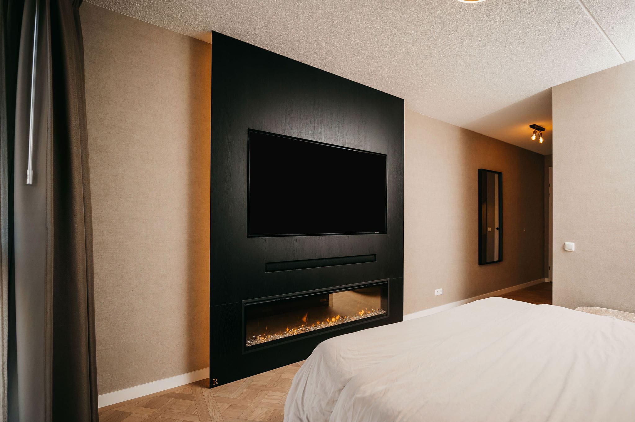 In Groningen realiseerden we een taupe cinewall, die functioneert als roomdivider, én zwarte cinewall in de slaapkamer.