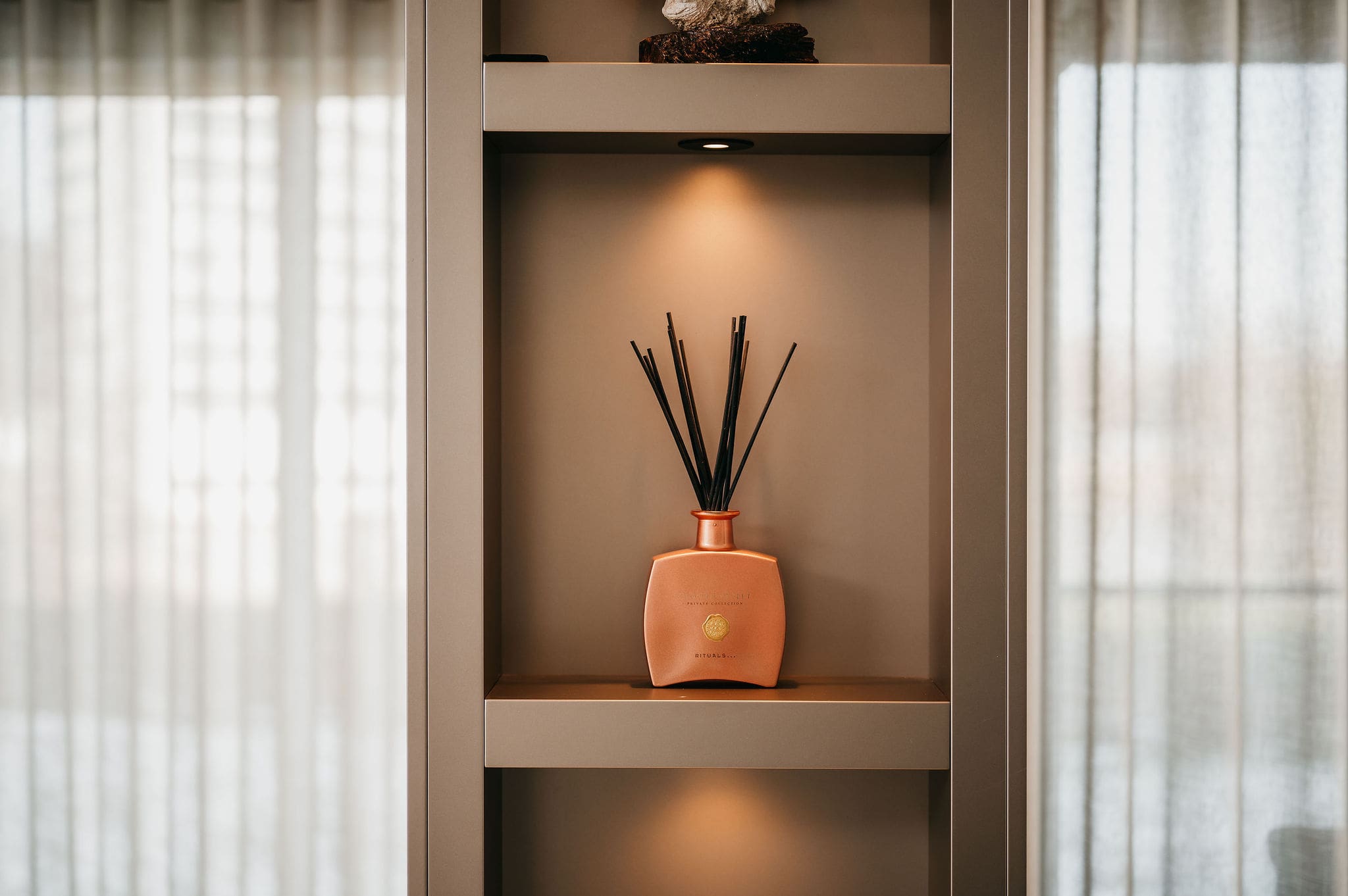 Aan de achterzijde vindt u een open vakkenkast. Net als op de kopse kant. Er is ruimte voor accessoires, belicht door sfeervolle spots. Tegelijkertijd zorgen gesloten kasten voor een opgeruimd geheel.