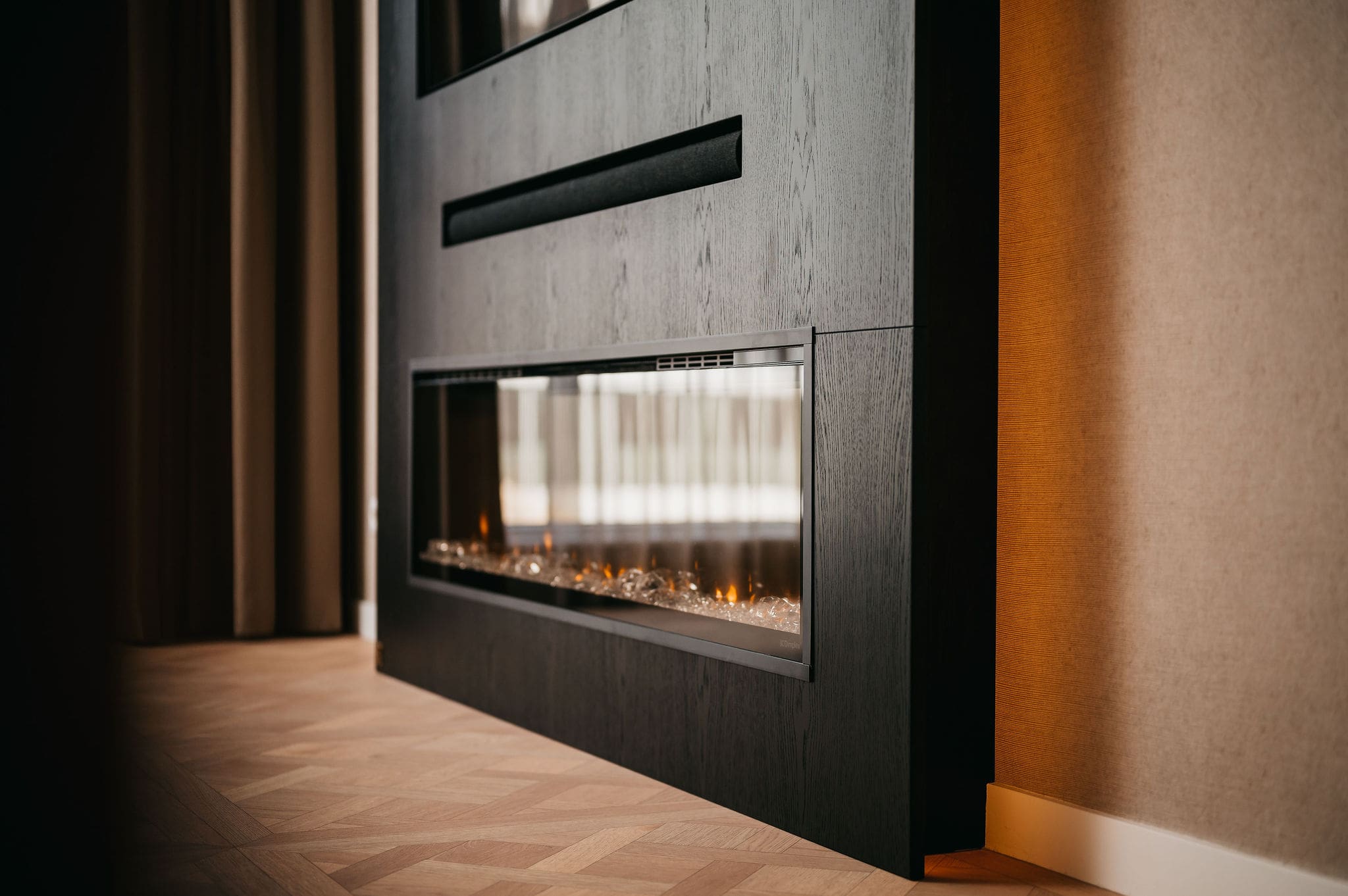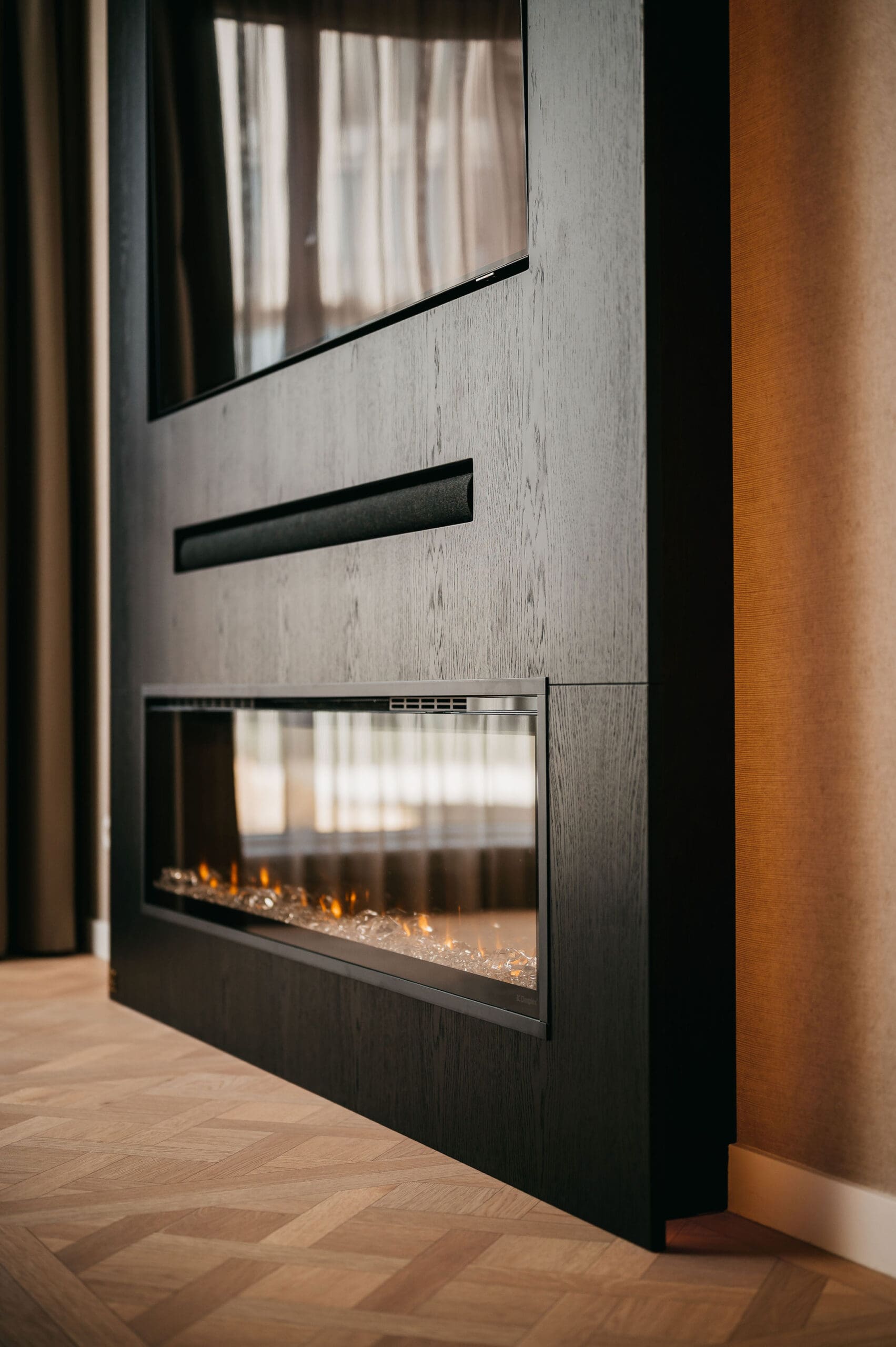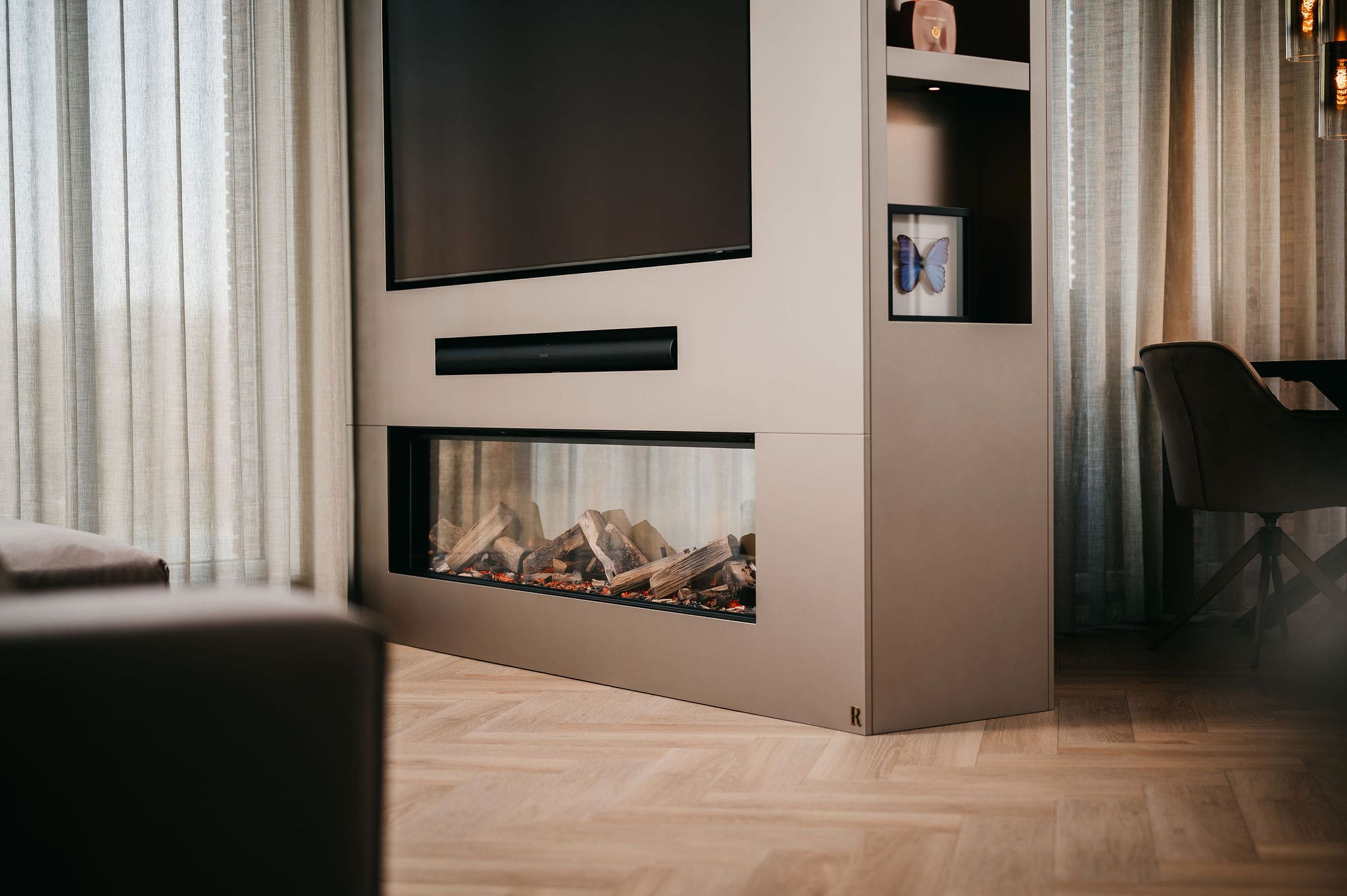 Vanuit de woonkamer kijkt u op een thuisbioscoop. Strakke lijnen definiëren het ontwerp, de tv en soundbar gaan er moeiteloos in op. De taupe tint voegt warmte toe, net als de elektrische sfeerhaard met houtlook.