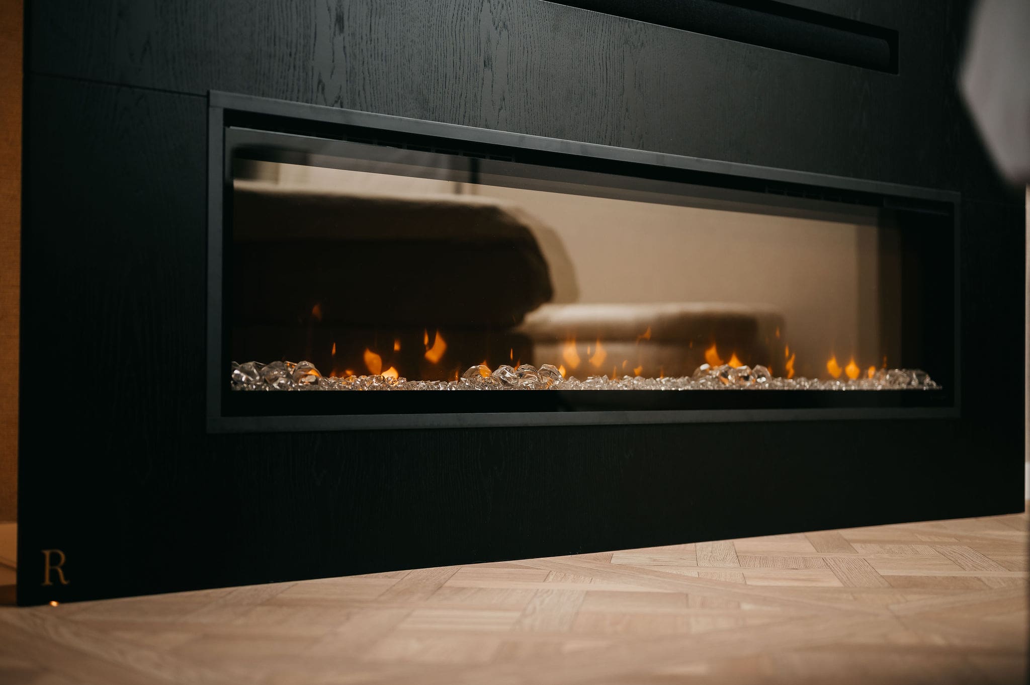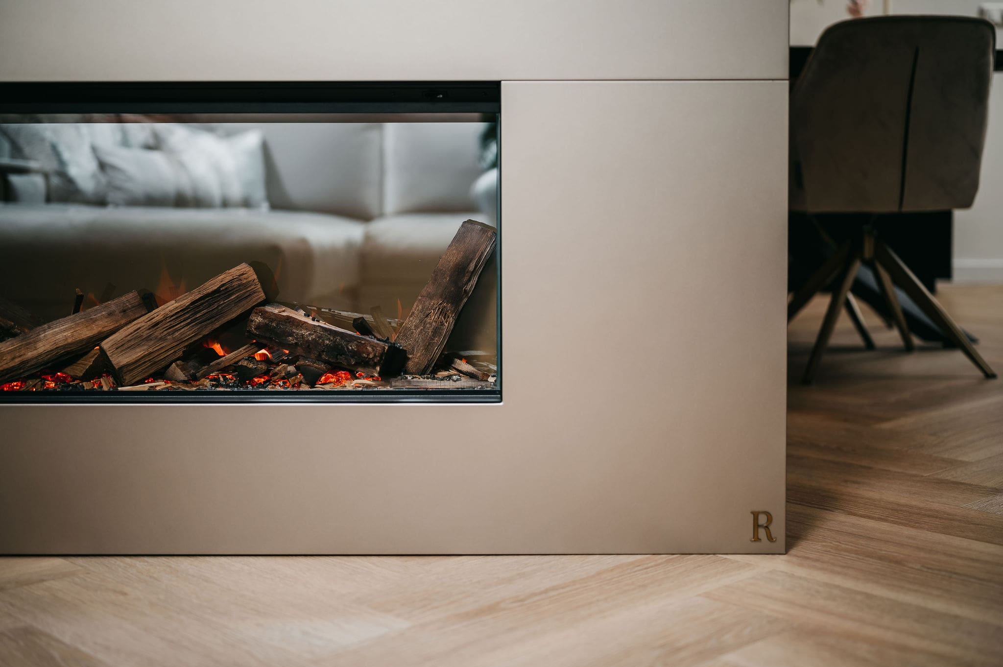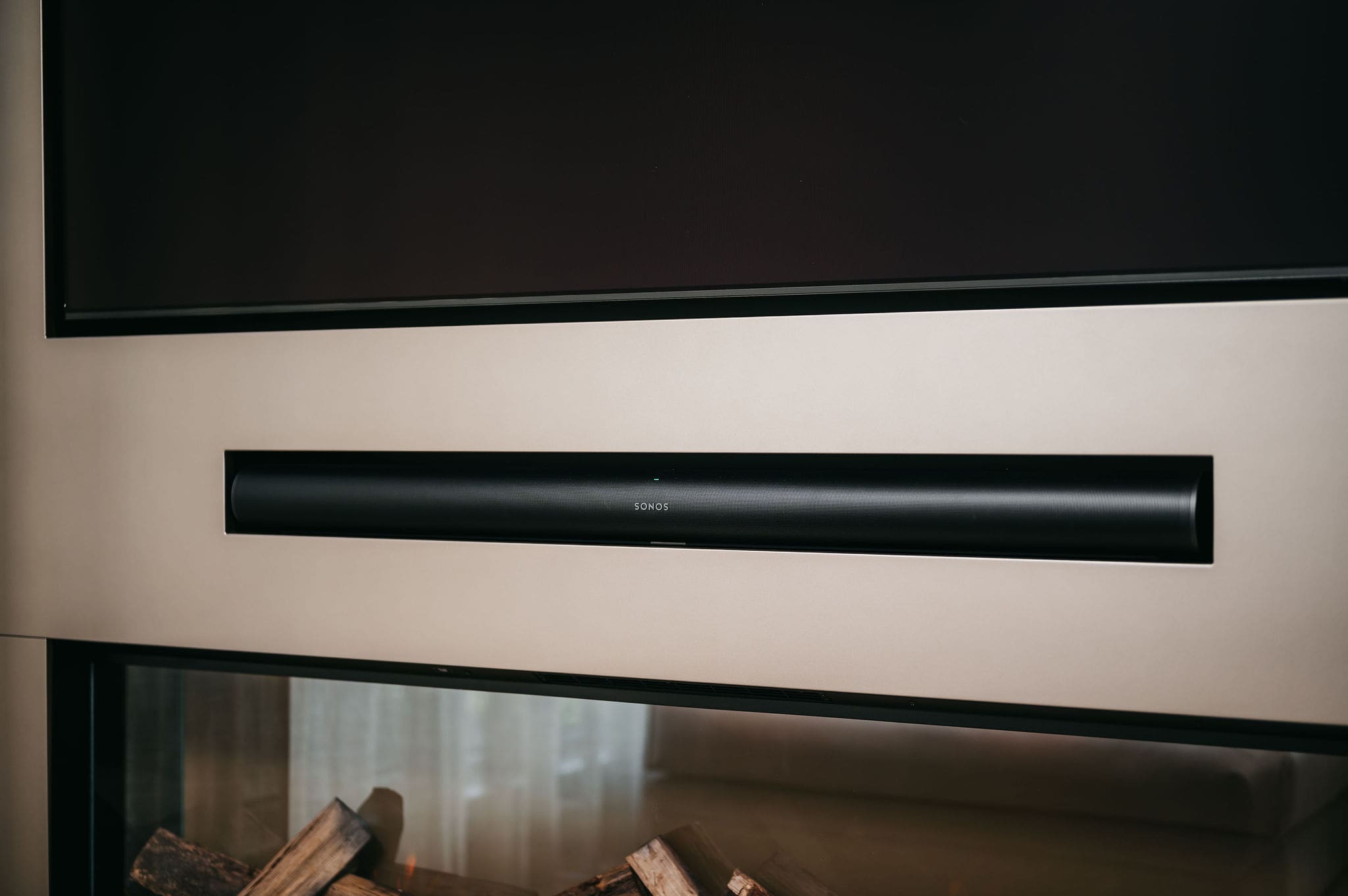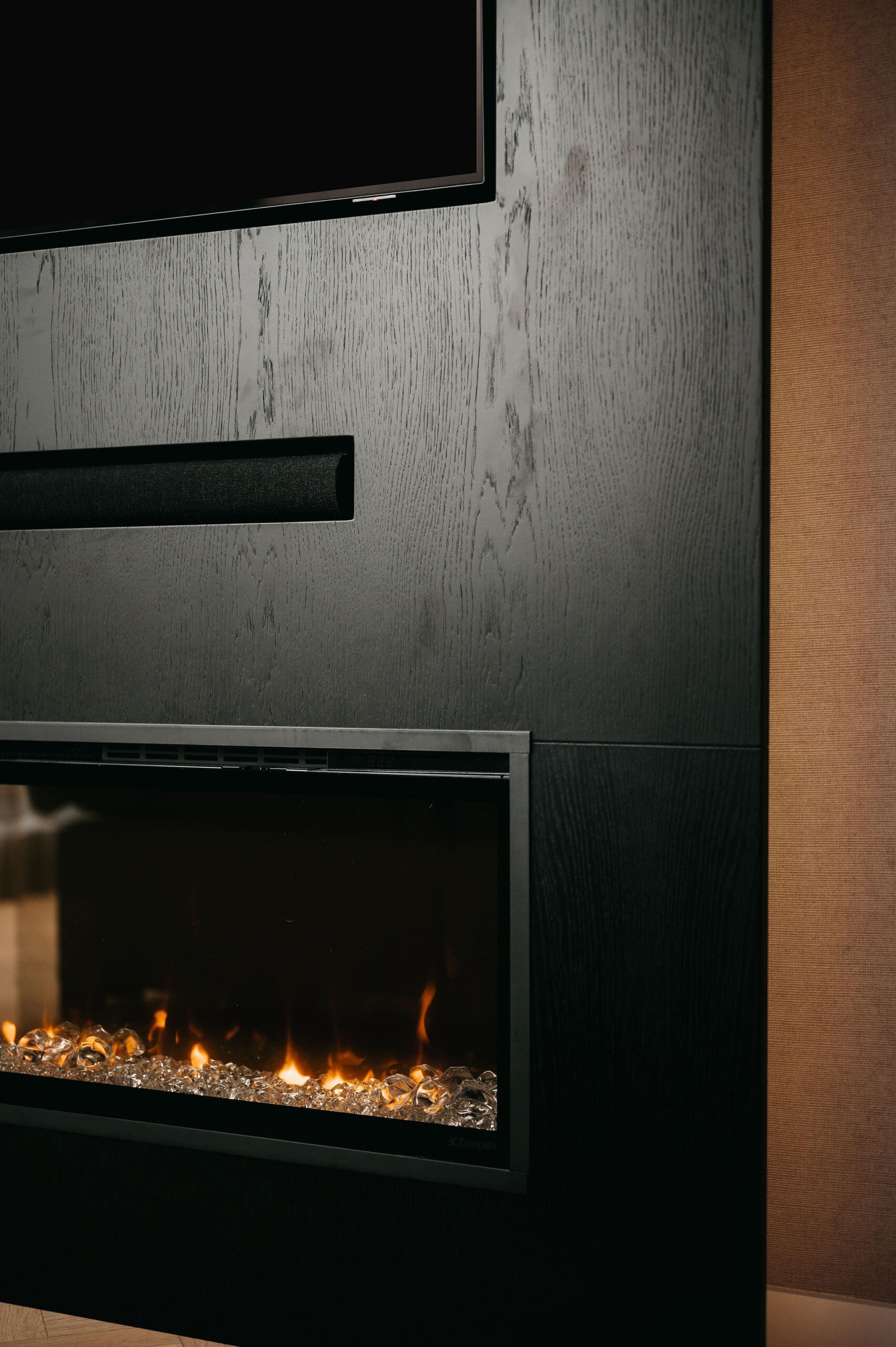 Vanuit de woonkamer kijkt u op een thuisbioscoop. Strakke lijnen definiëren het ontwerp, de tv en soundbar gaan er moeiteloos in op. De taupe tint voegt warmte toe, net als de elektrische sfeerhaard met houtlook.